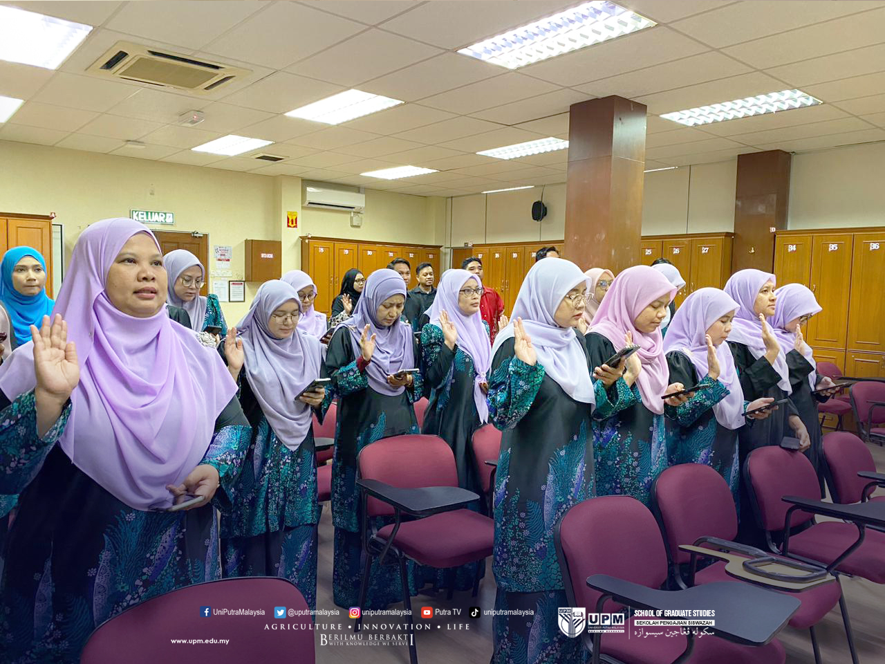 The Graduate School celebrates Workers' Day this year by holding a brief session to Renew the Pledge and Public Service Oath for the Graduate School staff. The oath reading was led by Mr. Mohamad Hafiz Mohamad (Assistant Registrar, Curriculum and Data Unit), Ms. Nur Nadiah Abdul Rahim (Executive Officer 3), Mr. Arif Sulaiman (Clerical Assistant (Administration and Operations)), and Ms. Siti Rahimah (Deputy Dean's Secretary).